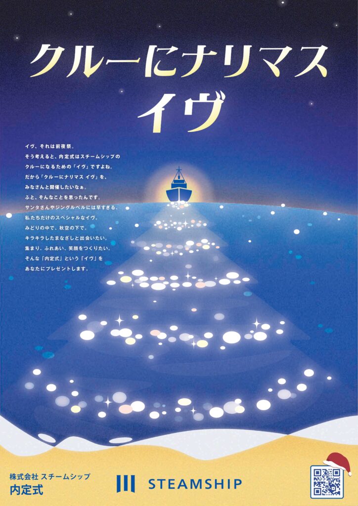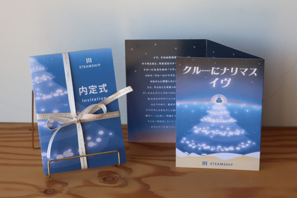 私たちは社員のことを「クルー」と呼んでいます。そして「イヴ」は前夜祭。ならば「内定式」はスチームシップのクルーになるための「イヴ」と考えたんです!このコンセプトに「内定というプレゼントを届けたい」というメッセージを込めました。