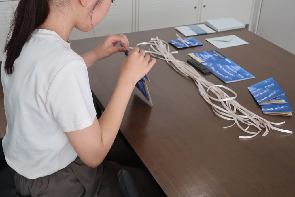 コンセプトに合わせ制作物もすべて作りこみ、ワクワク感を届けました。招待状はリボンをかけ、クリスマスプレゼント風に。招待状を立てると、表紙・裏表紙で「波のツリー」が見られる仕掛けになっています。