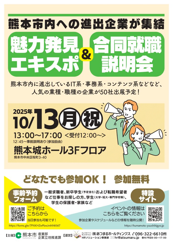 10/13(祝・月)熊本市が主催のイベント『魅力発見エキスポ&合同就職説明会』にスチームシップが参加いたします!